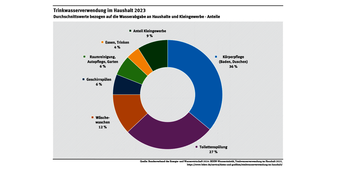 Demnach entfallen von den durchschnittlich 126 Litern pro Person und Tag etwa 36% auf Baden/Duschen/Körperpflege, 27% auf die Toilettenspülung und 12% auf das Waschen von Wäsche. Ein kleinerer Teil wird für die Reinigung von Wohnräumen und den Garten verwendet. Danach lassen sich mögliche Einsparpotenziale schnell ausfindig machen.